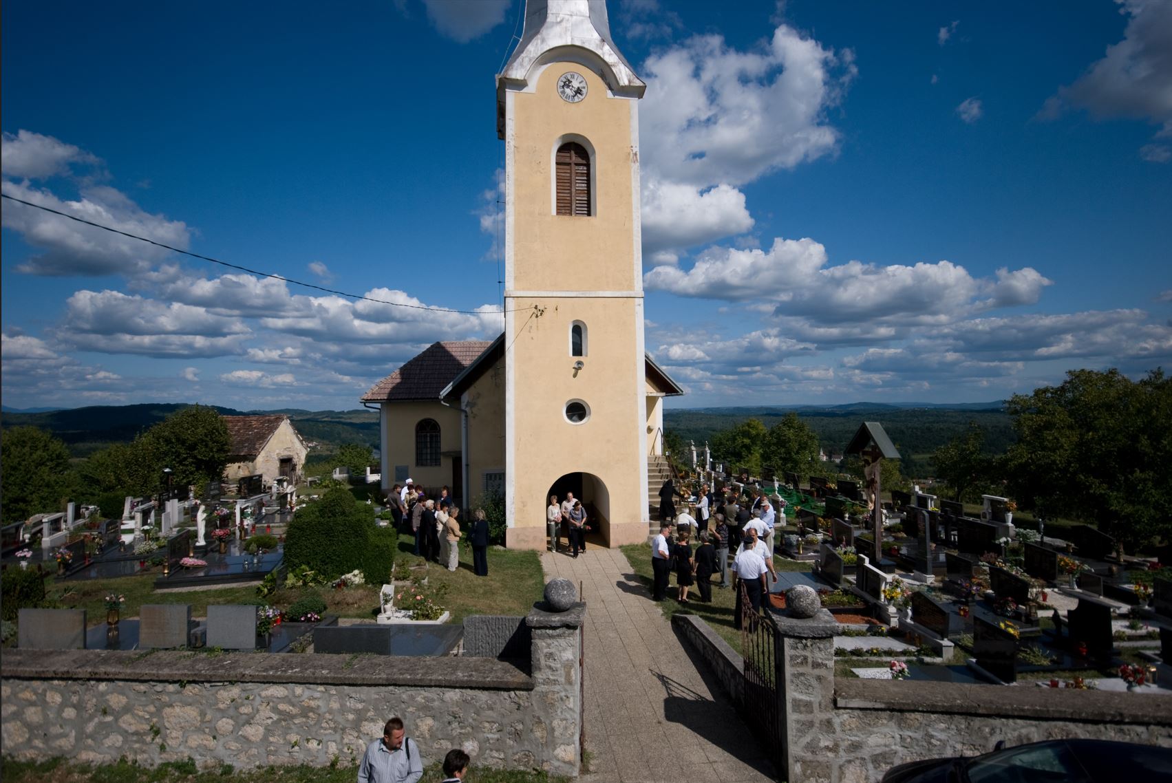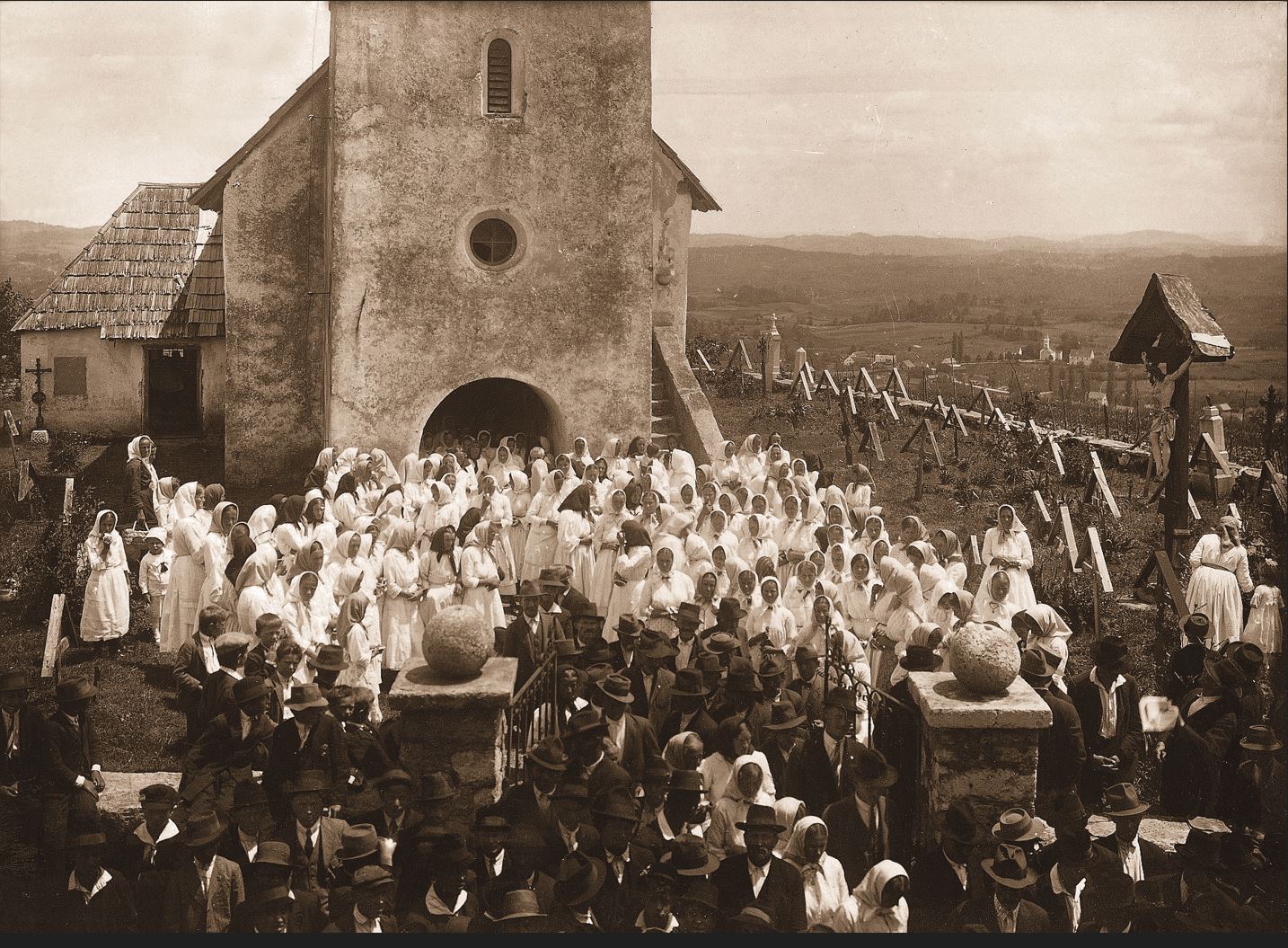 Gre za prizor odhajanja ljudi od maše na neko običajno poletno nedeljo pred 100 leti. V zgodovini oblačilne kulture naših krajev je to tisti trenutek, ko Bela krajina ni več vsa bela, ampak je že črno-bela. In samo še kako desetletje bo potrebno, da bo postala že vsa – »črna«, kot je v svojem članku iz leta 1929 tarnal nekdanji adlešiški župnik Ivan Šašelj, »ker se je narodna noša tudi v oddaljenih župnijah kakor Adlešiči, Preloka, Vinica zadnji čas že močno opustila«.*3