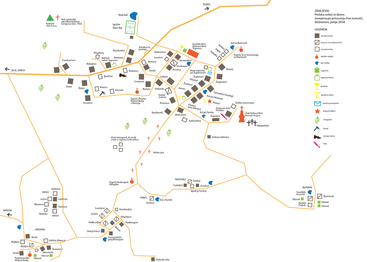 Objavljamo zemljevid, ki ga je po pričevanju in spominih Ane Ivanušič - Mežnarove nedavno izrisal Gregor Ivanušič. Vrisane so sedanje hiše in tudi nekdanje (danes prazne ali porušene), dodani so kali, nekatere dejavnosti v vasi nekoč in danes ...