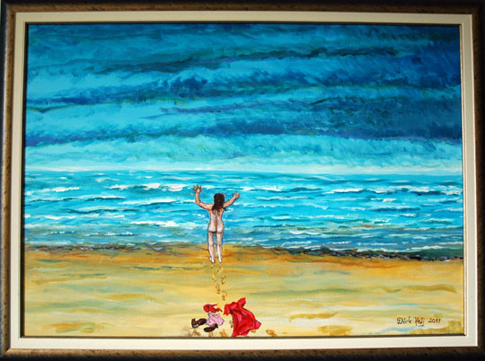 Vse to je zaznati tudi v njegovi sliki Srečanje z očiščujočimi elementi. Premišljena in izčiščena kompozicija ter jasna osnovna misel: vračanje k prvobitnemu, nazaj k naravi in njeni blagodejni energiji. Z naravo pa se lahko združiš in zaživiš naravno šele, ko odvržeš vso civilizacijsko navlako, taka in drugačna bremena, vse tisto, kar je umetno in nenaravno, skratka kar je v nasprotju z Bistvom.