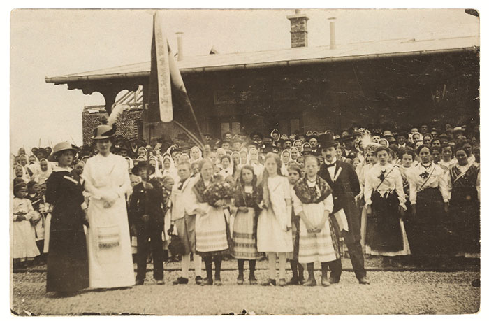 Okoli 11. ure se je mimo peljal slavnostni vlak v Metliko, ob tričetrt na tri pa se je pripeljal nazaj v Črnomelj. Kolodvor slavnostno okrašen, v prvi vrsti so stali župan Doltar, domači župnik in duhovščina z našega konca Belokrajine, v drugi vrsti vse uradništvo, ob straneh dolga vrsta šolske mladine, vihteč zastavice v slovenskih in cesarskih barvah. Pred otroci je bila skupina deklet v stari črnomaljski noši, ki se nekoliko od druge belokranjske noše razlikuje. Bile so tudi narodne noše iz Dragatuša in Bojancev ter druga dekleta in fantje v narodnih nošah in tisoče gledalcev. celo na višini nad mestno lozo so pozdravljale dohajajoči vlak dolge vrste ljudstva. požarna bramba je bila določena, da dela red, a ne najbolj uspešno. Mestna godba je slovesno zasvirala cesarsko himno in množica je med grmenjem strelov pozdravljala prišedši vlak z "živijo" klici. Raz vlaka je stopil minister Förster s številnim spremstvom in prevzvišeni g. knezoškof. Po pozdravnem nagovoru črnomaljskega župana Doltarja, deželnega poslanca Dermastia in drugih, je minister s posebnim zanimanjem opazoval pestre barve belokranjske noše.